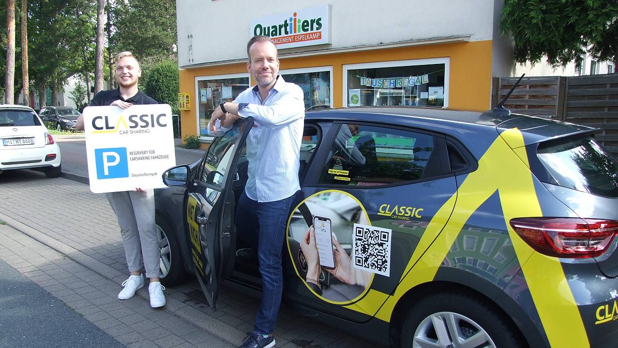 Auffällig gekennzeichnet durch den gelben Aufkleber Classic Car Sharing steht der Renault Clio vor dem Quartiersbüro an der Isenstedter Straße. Das Foto zeigt (l.) Vertriebsaußendienstmitarbeiter Marvin Griebe und in der Wagentür Mobilitätsmanager Nils Krenz. | © Karsten Schulz