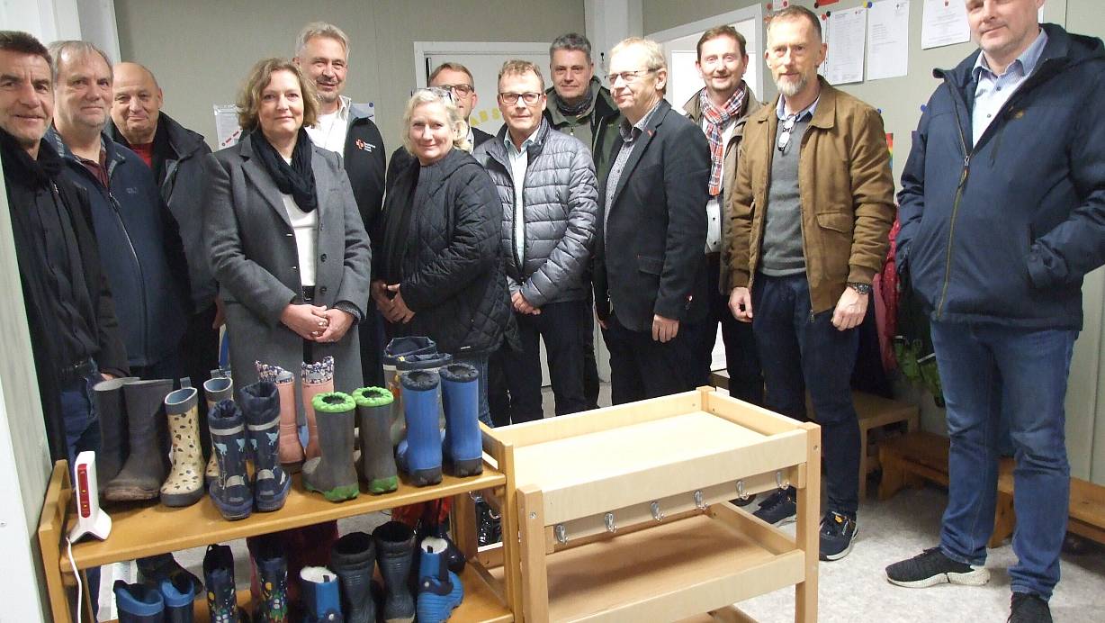 Die Mitglieder des Espelkamper Schulausschusses schauten sich den erst vor einem Jahr auf dem Gelände der DRK-Kindertgeseinerichtung aufgestellten Container an. Hier werden aktuell 17 Mädchen und Jungen betreut. | © Karsten Schulz