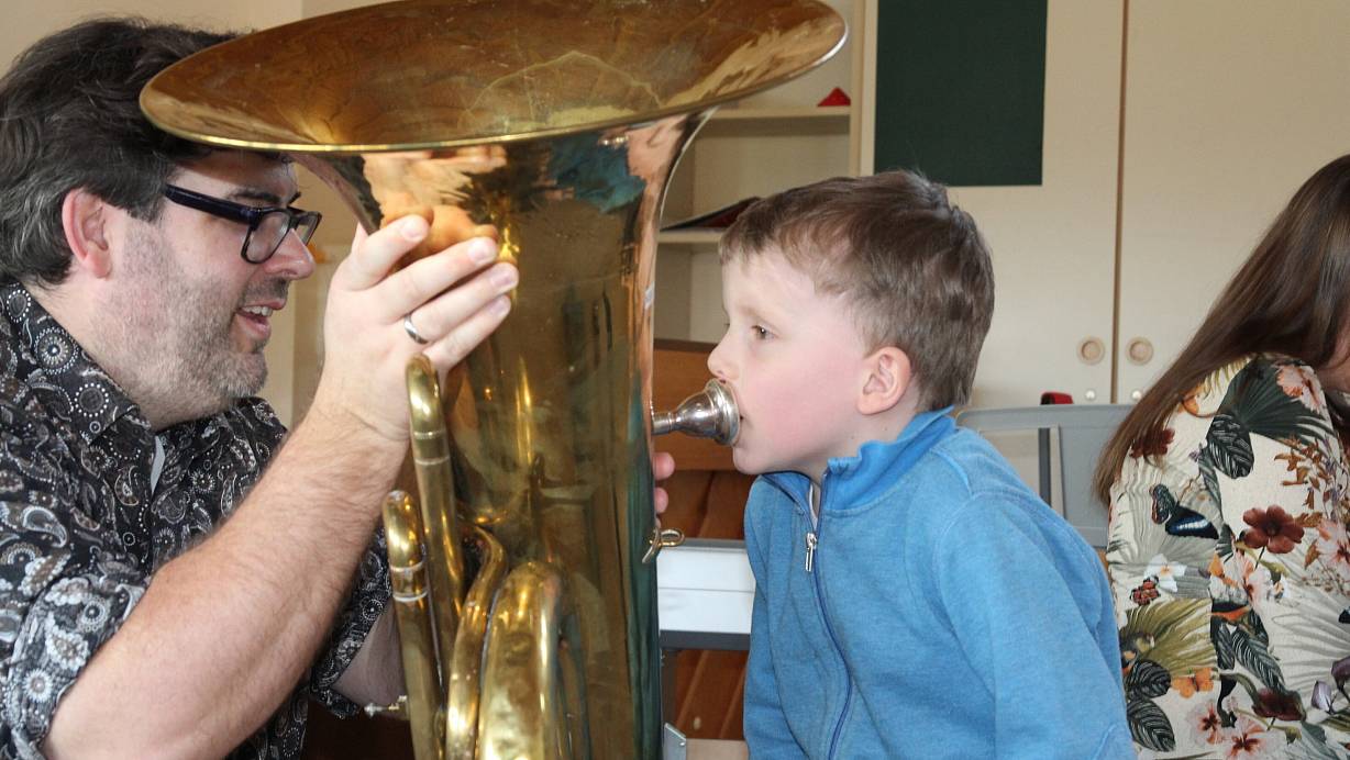 Am Tag der offenen Tür konnten die Besucher alle Instrumente ausprobieren. Christian Wöbking hält die große Zugposaune für Josia, der kräftig hinein bläst. | © Klaus Frensing