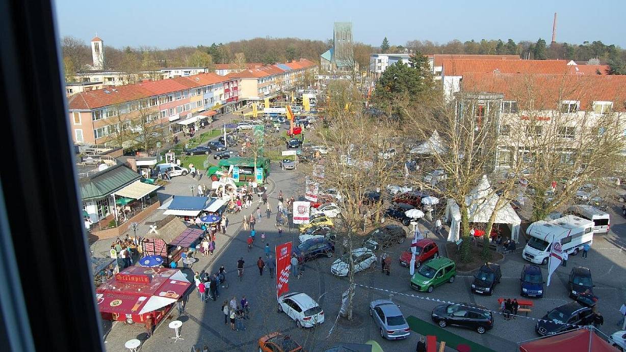 Das Stadtzentrum rund um die Breslauer Straße zwischen Bürgerhaus und Rathaus ist 2024 die zentrale Veranstaltungsmeile zum Stadtjubiläum. Das Foto ist 2010 vom Rathausdach aus entstanden und zeigt den Bereich der Breslauer Strße zwischen Thomaskirche und Rathaus. | © Stadt Espelkamp