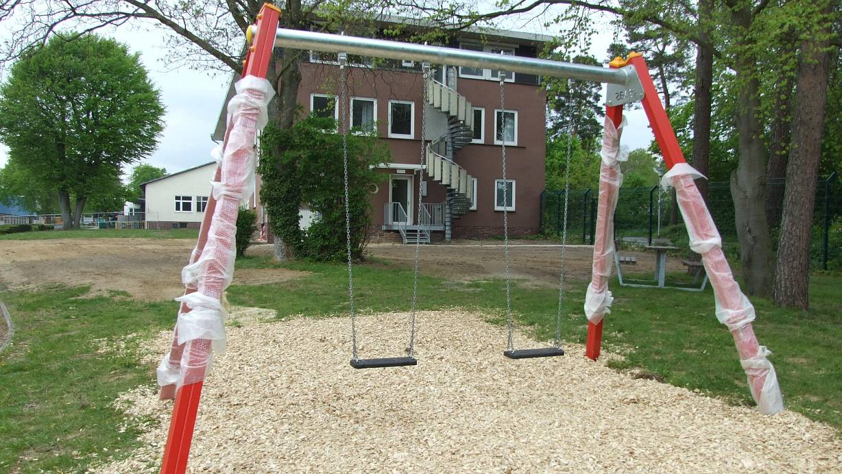 Inzwischen sind die Spielgeräte, wie hier die Schaukel, für den Spielplatz neben der zukünftigen Flüchtlingsunterkunft Haus Am Ring nicht mehr eingepackt. Sie stehen Familien mit Kindern, die hier einmal einziehen können, zur Verfügung. | © Karsten Schulz