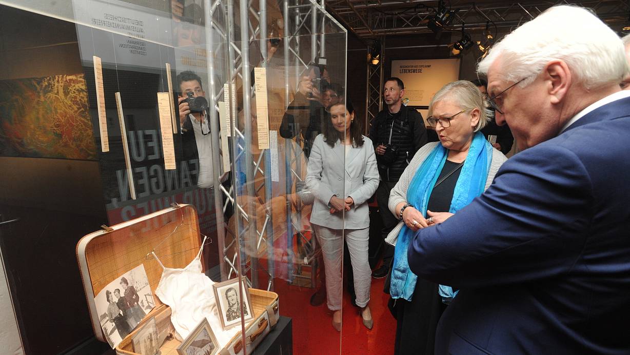 Interessiert schaute sich Bundespräsident Frank-Walter Steinmeier die Ausstellung zu Flüchtlingsstädten wie Espelkamp an, die das Deutsche Auswandererhaus in Bremerhaven konzipiert hat. Beobachtet von Simone Eick, Leiterin des Auswandererhauses, berichtete Zeizeugin Bettina Brath über ihre Geschichte. | © Joern Spreen-Ledebur