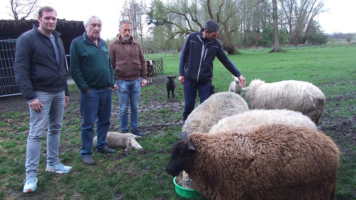Ortsvorsteher Jens Heiderich (v. l.), Schafbesitzer Hartmut Köster, Meik Blase sowie Schafbesitzer und Betroffener Marcus Fromm blicken auf das Lamm, das gerade vom Tierarzt eingeschläfert worden ist. Sie stehen auf der Weide von Hartmut Köster in Frotheim. | © Karsten Schulz