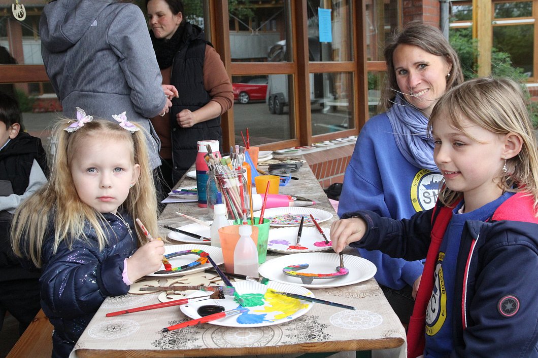 Auf dem ehemaligen Schulhof kamen die Kinder in Bewegung. Sie konnten mit den Kettcars des Familienzentrums umherdüsen oder mit dem Steckenpferd den Hindernisparcours der ZRFV bewältigen.Gleich nebenan lockten Kreativangebote. Das AWO-Familienzentrum lud dazu ein, aus CDs bunte Kreisel zu basteln und der Zucht-, Reit- und Fahrverein Frotheim-Isenstedt zum Bemalen von Hufeisen. Hier konnte man das Glück mit nach Hause nehmen. Ein besonderer Hingucker waren die Voltigierübungen. Jan und Anna-Lena Stallmann sowie Charlotte Niedringhaus präsentierten am Holzpferd einige sehenswerte Figuren, die vom Publikum bestaunt wurden.