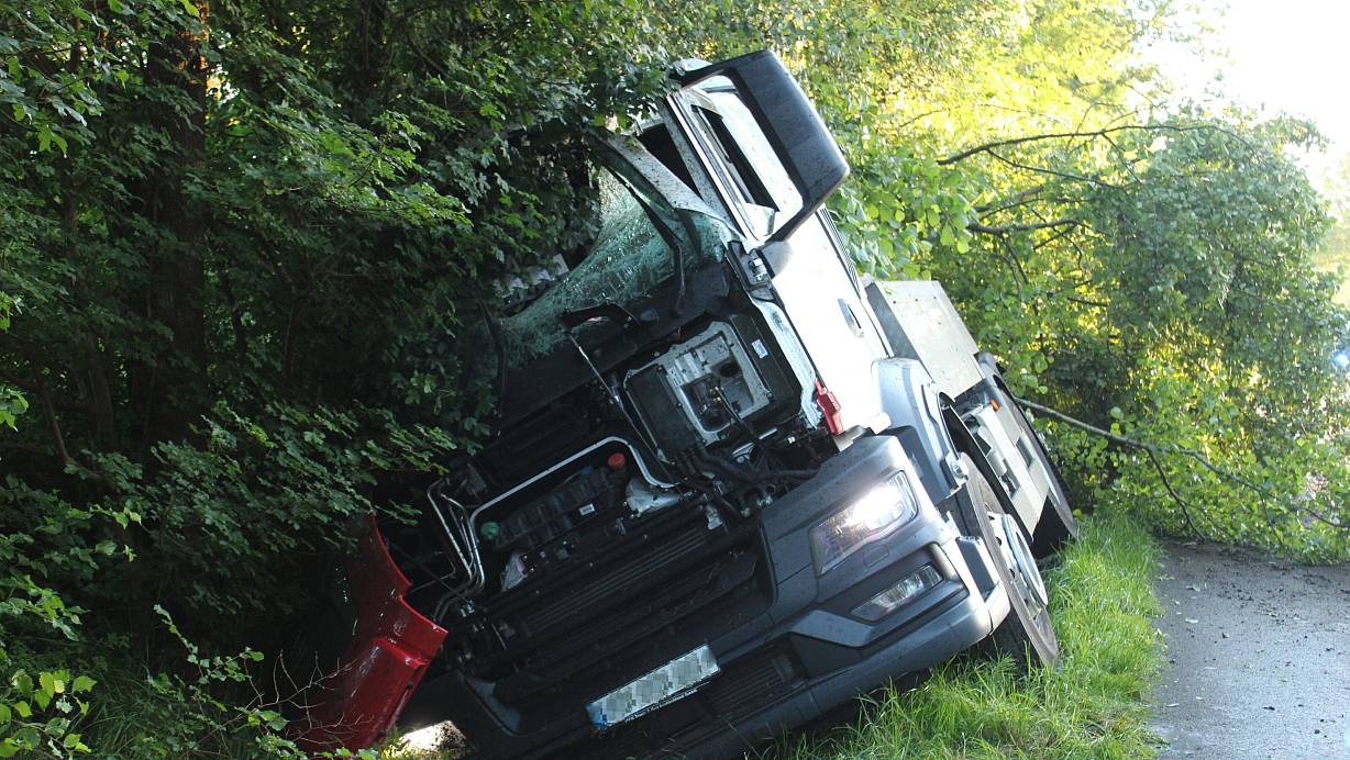 Der tonnenschwere Milchwagen musste aus einem Straßengraben geborgen werden. | © Polizei Minden-Lübbecke