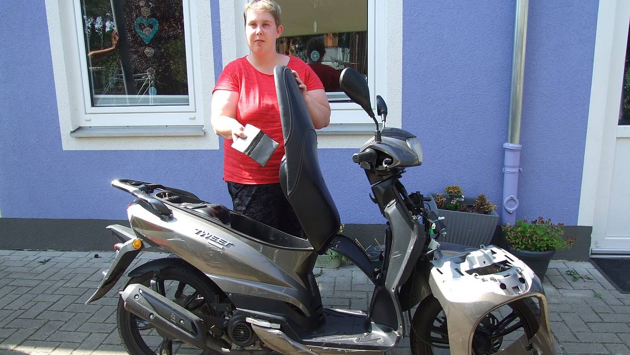 Natascha Birkholz mit ihrem zerstörten Motoroller vor ihrem Domizil in der Wittekindshofer Wohngemeinschaft am Glatzer Garten. | © Karsten Schulz