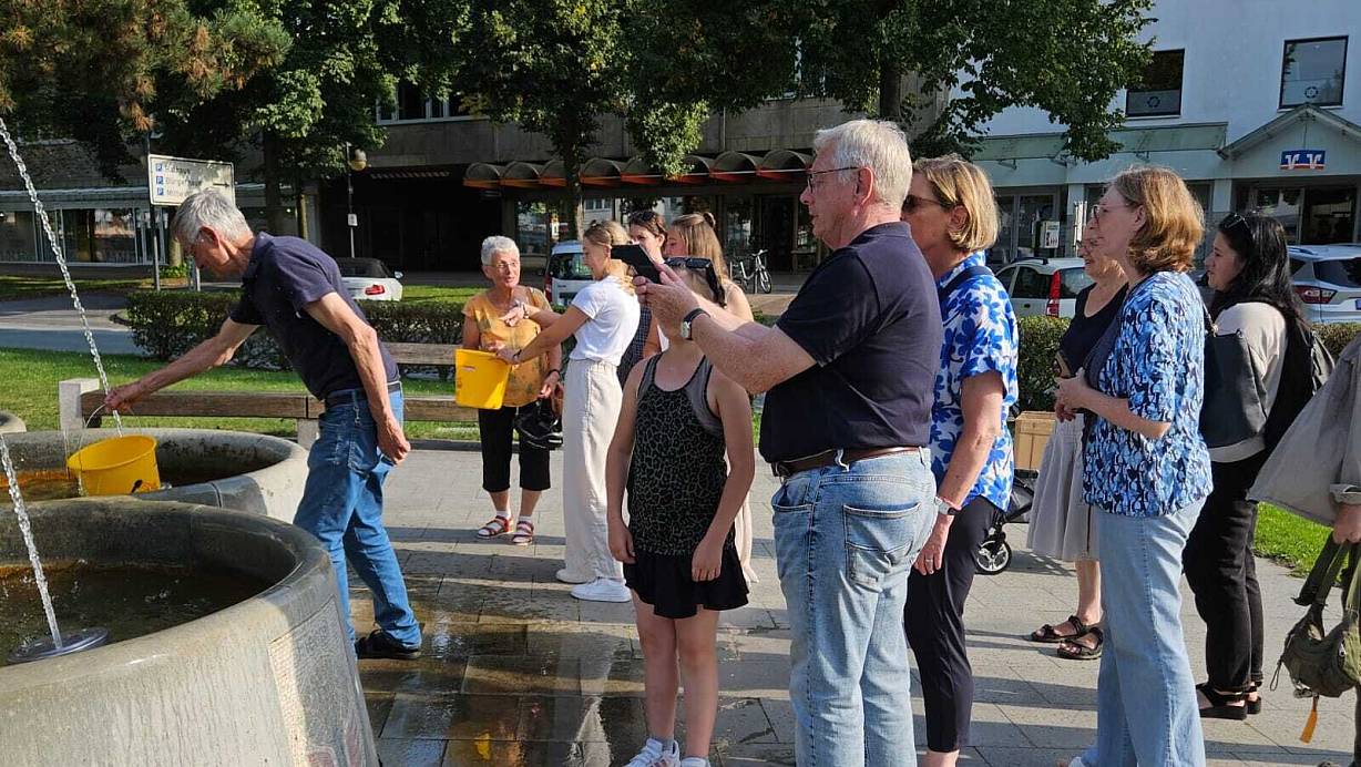 Dass Pflanzen die Luft durch den natürlichen Effekt der Verdunstungskühlung kühlen, wurde ebenfalls unter die Lupe genommen. Dieser Eindruck bestätigte sich bei der Messung mithilfe der Daten-Logger „im Wäldchen“ zwischen der evangelischen Kirche und dem Schulareal: Hier wurde – an einem der heißesten Tage dieses Jahres – mit rund 27 Grad Celsius Lufttemperatur – lediglich eine schwache thermische Belastung festgestellt. Der Effekt der Verdunstungskühlung gilt für die Wasserflächen in der Stadt ebenso, was die Teilnehmenden durch Messungen beim Passieren des Brunnens im Grünanger feststellten.