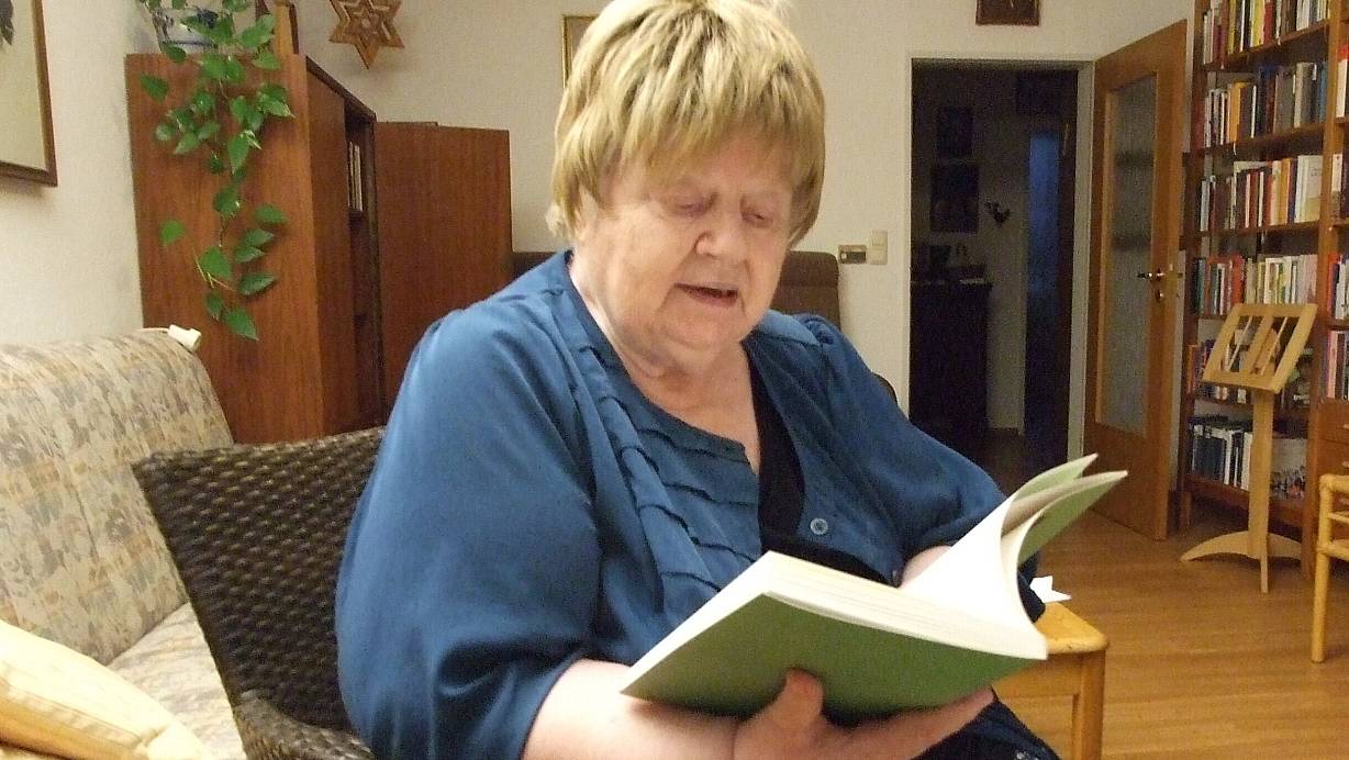 Marlies Kalbhenn in ihrem Wohnzimmer. Sie liest aus dem Buch "Heimat", das in Einfacher Sprache geschrieben ist und jetzt von der Lebenshilfe Berlin herausgegeben wurde. | © Karsten Schulz