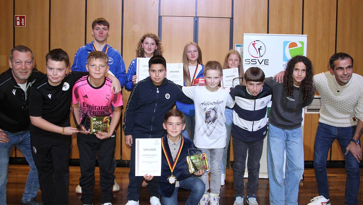 Die Jugend-Sportlerinnen und Sportler sowie Jugend-Mannschaft des Jahres: die U-11 von FC Preußen (1. Reihe) sowie Jakob Orasteanu (TV Espelkamp) ganz vorn und Julian Krato, Stine Meyer, Liah Tirre und Zoey Marie Gunia (2. Reihe, v.l.). | © Klaus Frensing