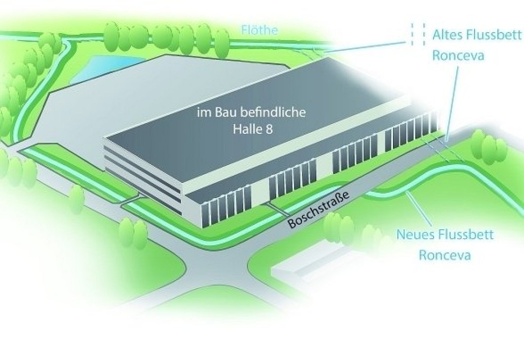 Das alte Bett des Baches, das direkt am Lübbecker Werk entlang fließt, muss verlegt werden, um die neue Logistikhalle an die bereits bestehenden Hallen anschließen zu können. In den letzten Tagen und Wochen wurde deshalb ein neues Bett ausgehoben, das an der Westseite der neuen Halle entlangführt und nördlich des Werkes in die Flöthe mündet.