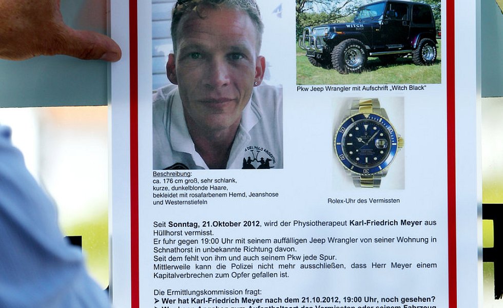 Am 23. Oktober 2012 erscheint Christiane R. mit der Schwester ihres Lebensgefährten auf der Polizeiwache Lübbecke. Sie gibt an, Karl Friedrich Meyer habe zwei Tage zuvor das gemeinsam bewohnte Haus im Schnathorster Holz in Hüllhorst gegen 19 Uhr verlassen. "Ich muss noch mal weg", soll er gesagt haben - Ziel oder zeitliche Rückkehr unbekannt. Das sei öfters mal vorgekommen, sagt Christiane R., aber immer nur stundenweise und nie über Nacht. Sein Handy und die EC-Karte habe er zu Hause gelassen, führe aber circa 6.000 Euro Bargeld mit sich. Außerdem würde sich Meyer in der letzten Zeit sexuell zu Männern hin umorientieren.