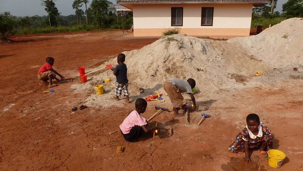 Spielen im Sand: Die Wohnanlage in Dimako mit allen neuen Gebäuden liegt direkt am Rand des Urwaldes. Den Kindern bietet das Heim geschützten Raum zum Toben und zum Spielen. Und auch in Kamerun spielen die Kleinen gern mit Sand. | © Baptisten Brüdergemeinde