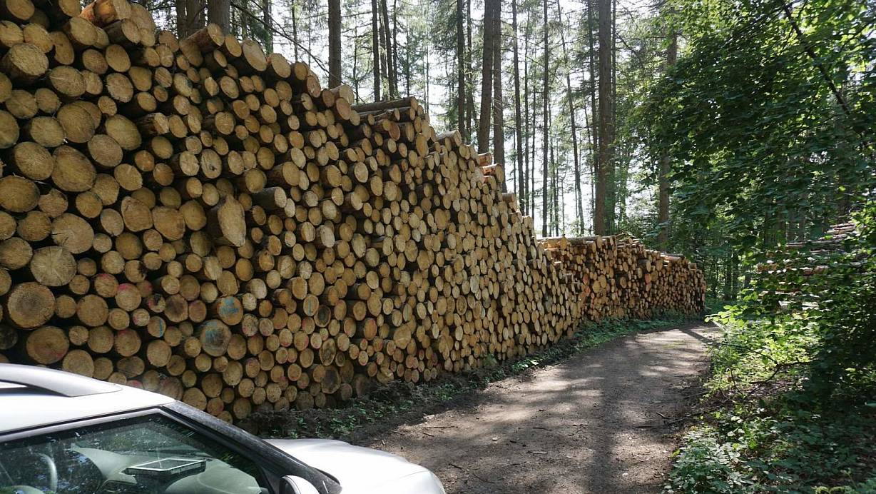 An den Wegen stapeln sich die Stämme. Der Holzmarkt läuft im Augenblick nicht so gut, sagen die Waldbesitzer. | © Michael Grundmeier