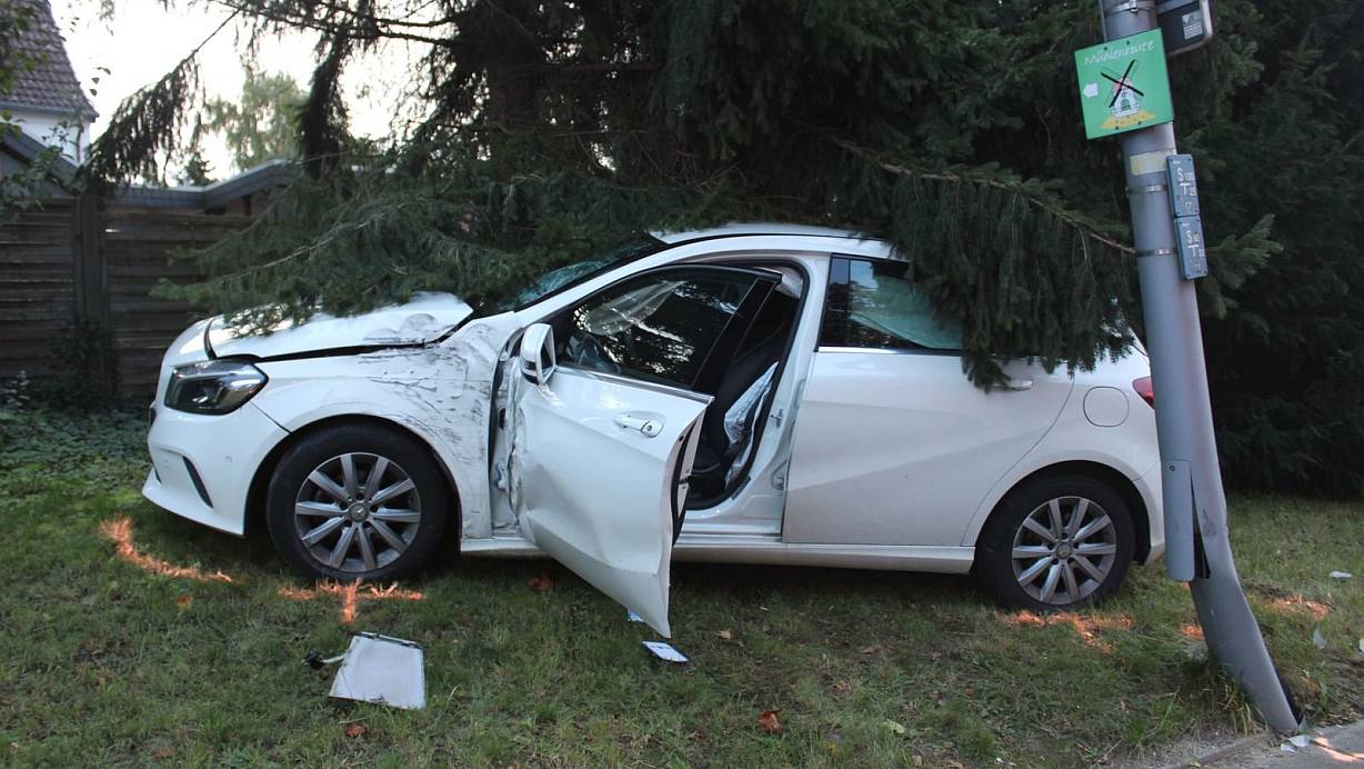 Durch die Wucht der Kollision kam der Mercedes ins Schleudern und nach rechts von der Straße ab. Hier prallte der Wagen gegen eine Straßenlaterne und kam erst im Grüngürtel neben der Fahrbahn zum Stehen. Der Mercedes war nicht mehr fahrbereit und musste abgeschleppt werden. Den Sachschaden schätzt die Polizei auf rund 17.000 Euro.