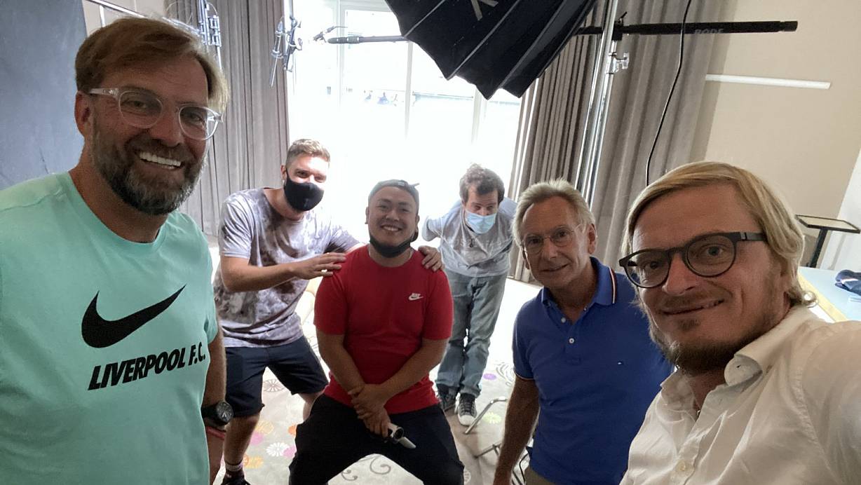 Liverpool-Trainer Jürgen Klopp (v. l.), Kameramänner Manuel May und Duc Pham, Ton-Ingenieur Matthias Paul, Produzenten Dieter Gruschwitz (ehemaliger Sportchef ZDF) und Mario Kottkamp, der aus Hüllhorst kommt. | © Mario Kottkamp/Jau!Media