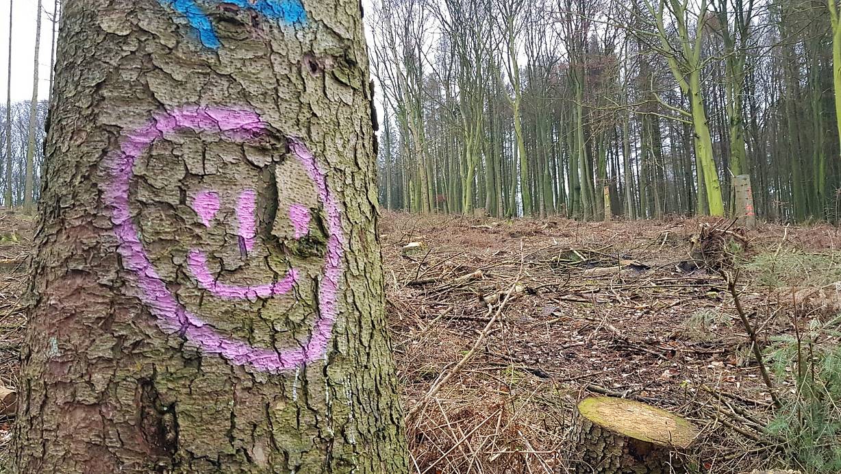 In dem trostlosen Bild, das der Wald gerade vielerorts im Wiehengebirge und im Stemweder Berg wegen großflächiger Abholzung ab gibt, sticht der rosafarbene Smiley ins Auge. Doch ob dieser Baum stehen bleiben wird, ist die Frage, denn es stehen noch weitere Abholzungen an. | © Heike von Schulz
