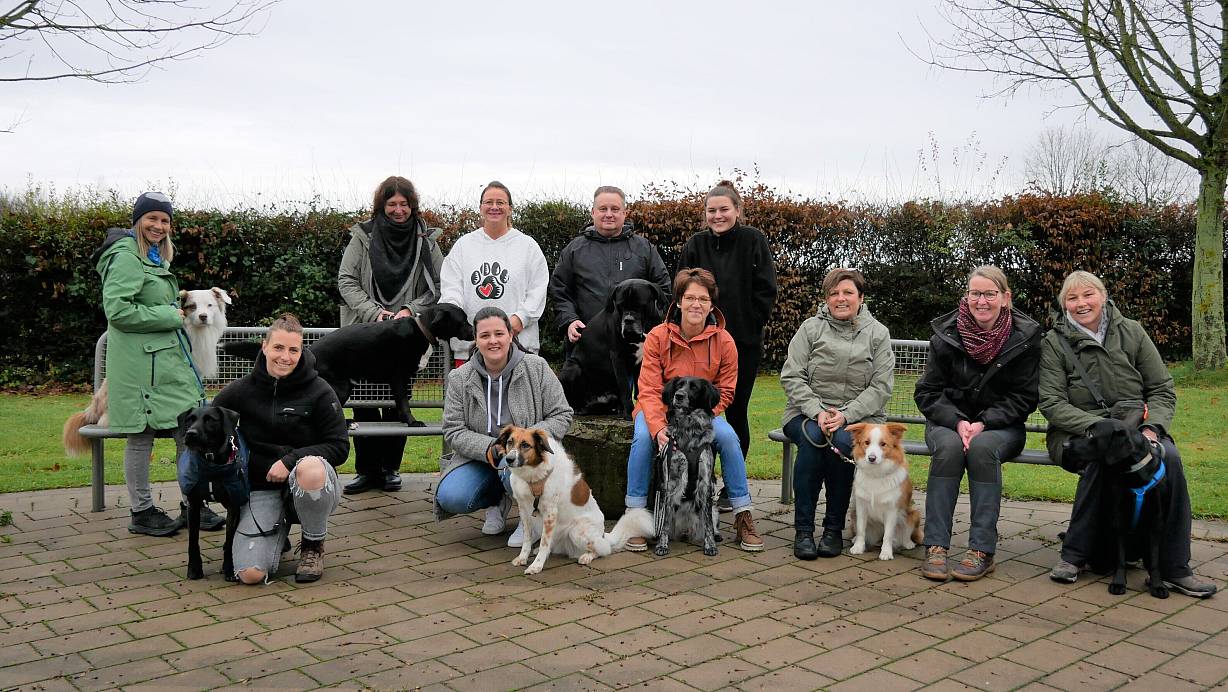 Normalerweise dürfen die Teilnehmerinnen und Teilnehmer ihre Hunde nicht mitbringen. Doch für die Gruppe der Hüllhorster Hundeschule AndersArtigDogs gibt es diesmal eine Ausnahme, da sich die Tiere bereits kennen.