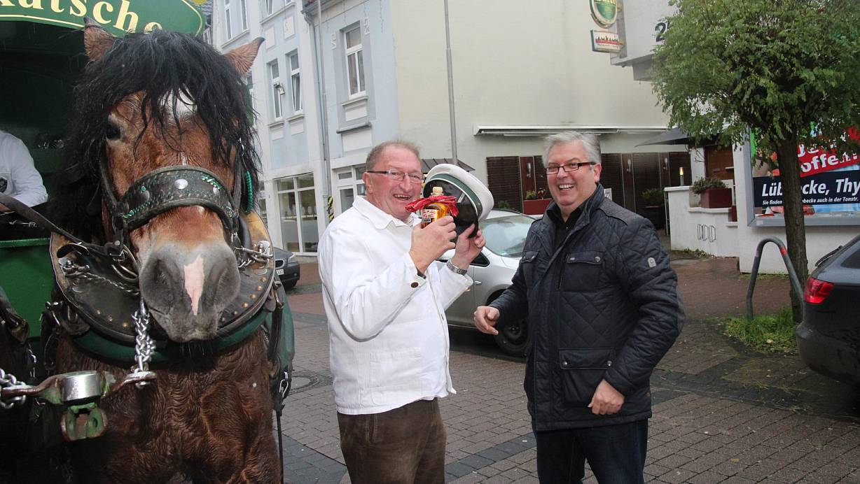 Abschiedsgeschenk: Toni Rudic überreicht Reinhold Hahler eine Flasche Julischka, eine Mischung aus Pflaumen- und Birnenschnaps. | © Jan Ahlers