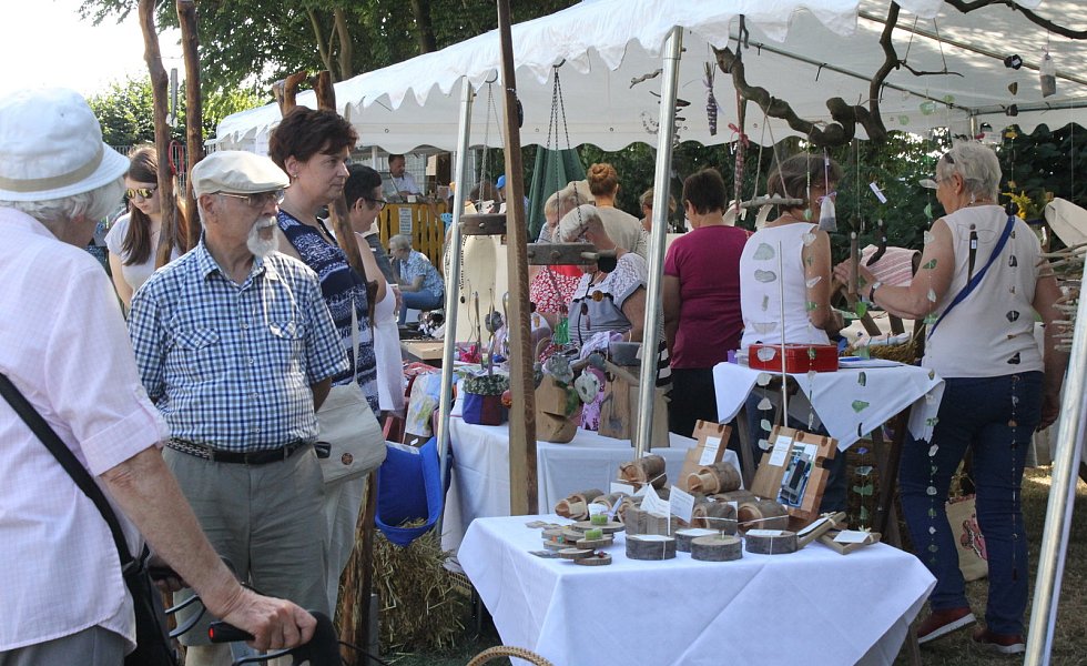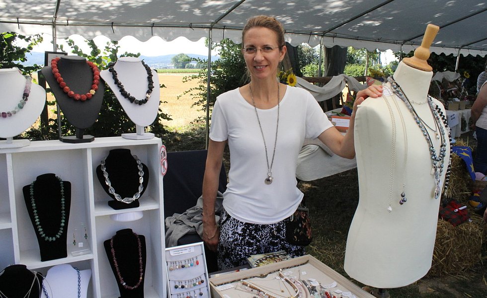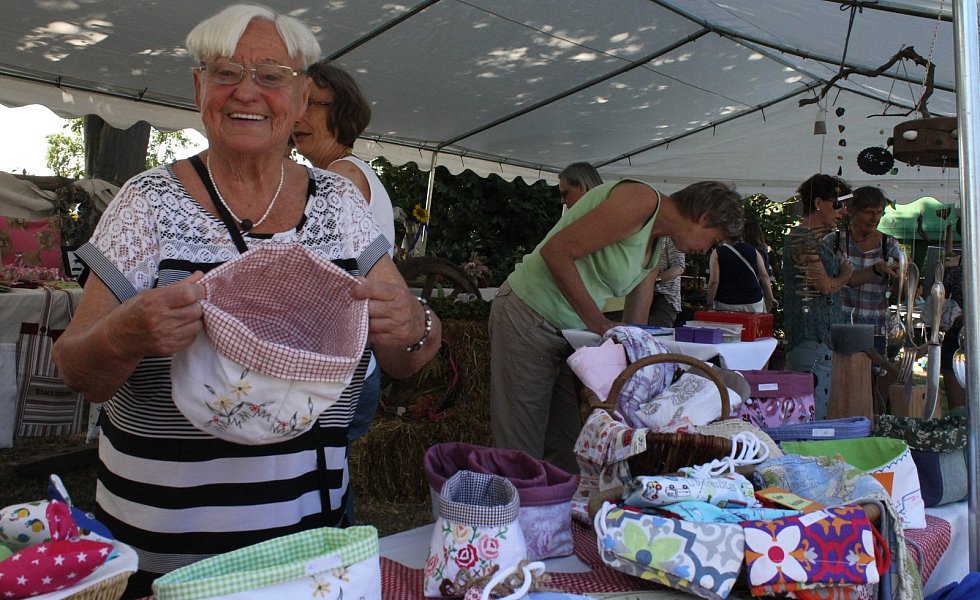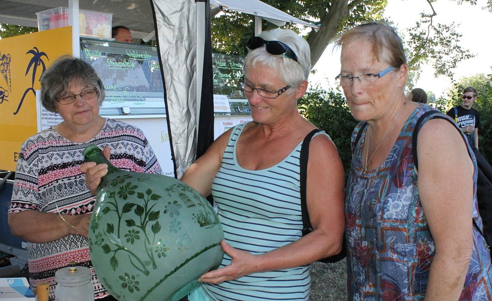 Der Stockhauser Markt selbst lockte auch mit seiner zwölften Ausgabe viele Gäste an. Zwar hatten fünf Aussteller angesichts der Hitze kurzfristig abgesagt, doch 20 Stände in der Begegnungsstätte und draußen auf der Wiese sowie die Vitrine präsentierten eine große Vielfalt an kreativem Handwerk für Haus und Garten. Den Vorsitzenden der Stockhauser Landfrauen, Ulrike Spieker und Barbara Siebe, war es wieder gelungen, neben vielen Stammgästen auch einige neue Kunsthandwerker nach Stockhausen zu holen. Beispielsweise Rita und Hans Nagel, deren schmucke Bonbonnieren aus alten Flaschen und Einweckgläsern, nicht nur Luise Dinkelmann-Meyer und Elisabeth Stammeier aus Stemwede ins Auge fielen. "Es lohnt sich alte Dinge nicht wegzuwerfen", meinten sie mit Blick auf die vielfältig nutzbaren Kunstwerke.