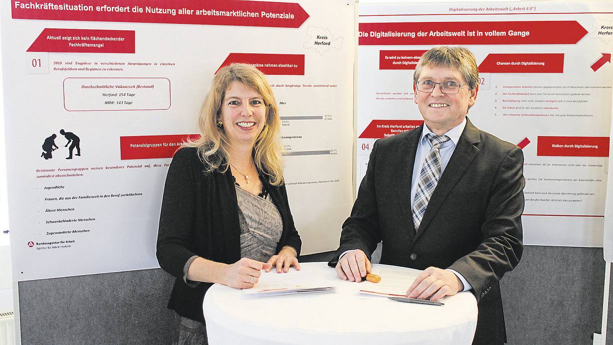 Die Agentur für Arbeit hat die beiden großen Herausforderungen am Arbeitsmarkt - den Fachkräftebedarf und die Digitalisierung - im Blick. "Die Antwort sowohl auf den Fachkräftebedarf als auch auf die Digitalisierung ist die gleiche: Ausbildung, Qualifizierung und Weiterbildung. Werden Geringqualifizierte zu Fachkräften, können sie den Bedarf decken. Bilden Beschäftigte sich in ihrem Berufsfeld weiter, wird die Digitalisierung sie wenig betreffen, da sie neue Tätigkeiten ausüben können", erklärt Stegh. "Aus diesem Grund wird die Agentur für Arbeit sich auch im Kreis Minden-Lübbecke 2019 stark auf das Thema Qualifizierung konzentrieren. 70 Prozent der Personen, die von uns qualifiziert wurden, sind sechs Monate später in sozialversicherungspflichtiger Beschäftigung. 2019 werden wir, auch aufgrund neuer Gesetze, diesen Fokus noch ausbauen."