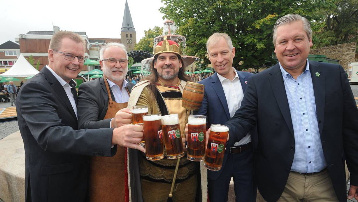 Thomas Holle (Brauerei Barre); v. l.), der stellvertretende Landrat Reinhard Wandtke, Gambrinus, Lübbeckes Bürgermeister Frank Haberbosch und Brauerei-Chef Christoph Barre stießen an. | © Joern Spreen-Ledebur