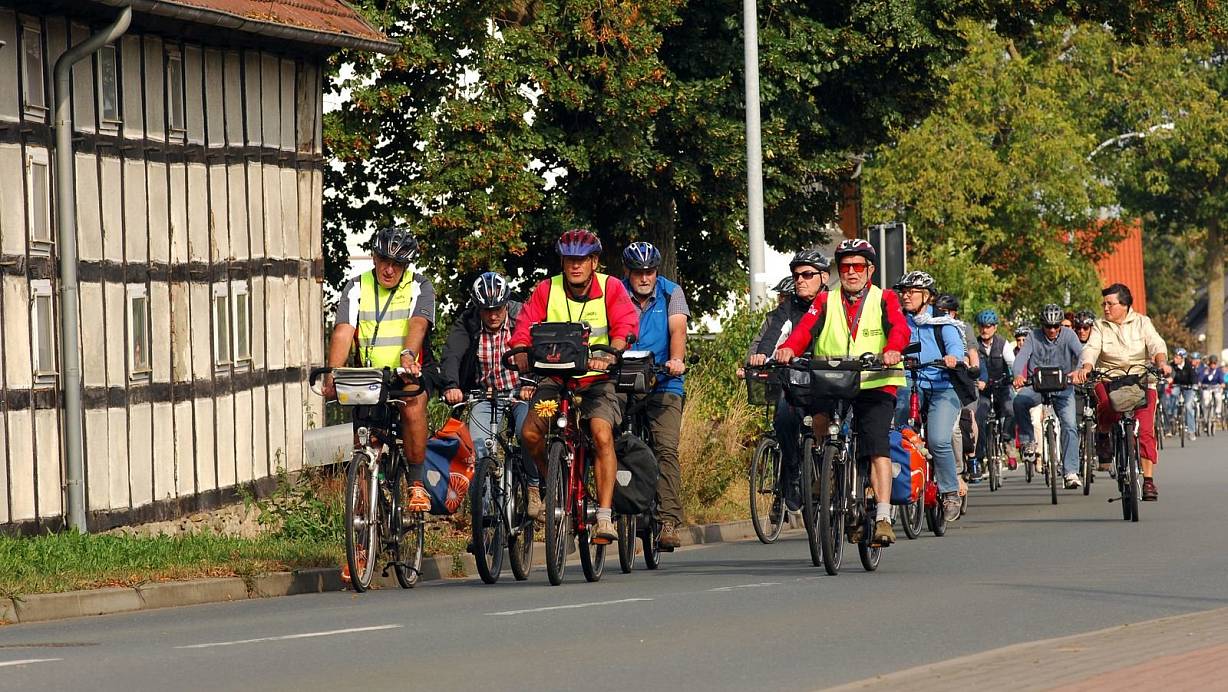 Kurz vor Obermehnen: Idyllische Fachwerkhäuser säumen den Weg der Radfahrer durch das Lübbecker Land. | © Heike von Schulz