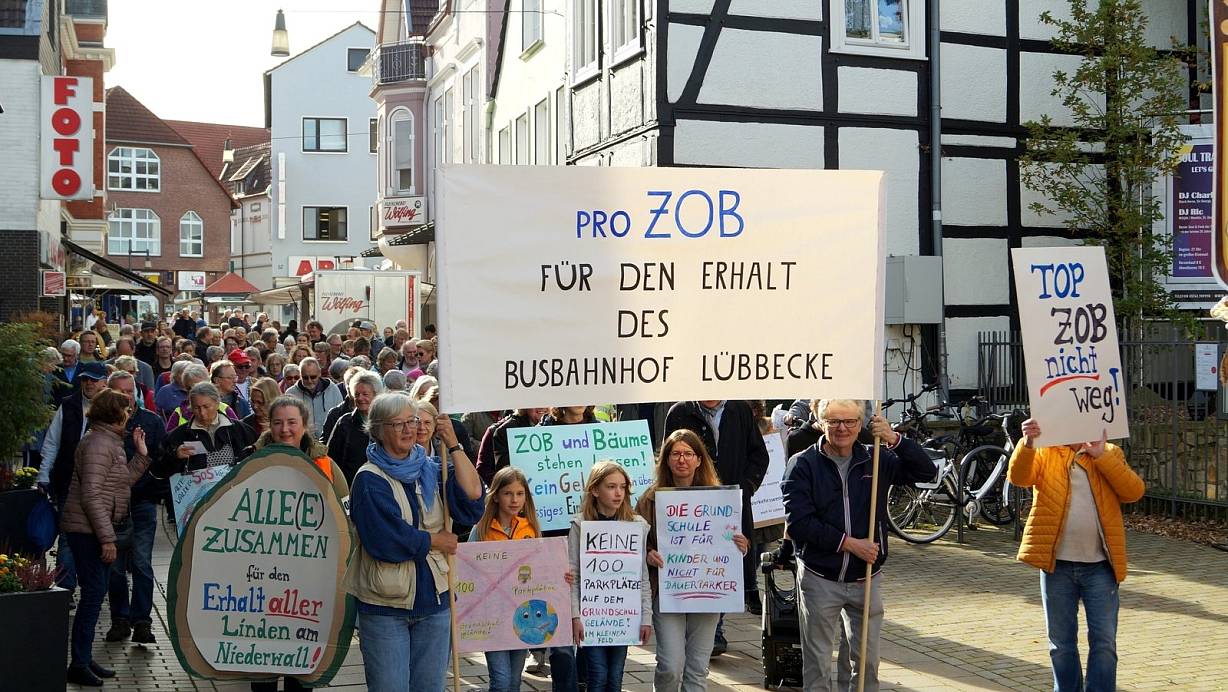 Es war ein machtvoller Zug, der sich kurz vor Mittag am Burgmannshof formierte. Rund 150 Lübbecker hatten sich dort versammelt, um laut für den Erhalt "ihres" ZOB zu demonstrieren. "Weil ihr uns den Bahnhof klaut", riefen die Bürger in Sprechchören. Das gesamte Altersspektrum war vertreten, fast alle hatten eine ordentliche Portion Wut im Bauch, wie es ein Senior formulierte: "Ich kann nicht verstehen, warum ein gerade erst neu gebauter ZOB jetzt schon wieder abgerissen wird. Das ist eine Verschwendung", meinte er.