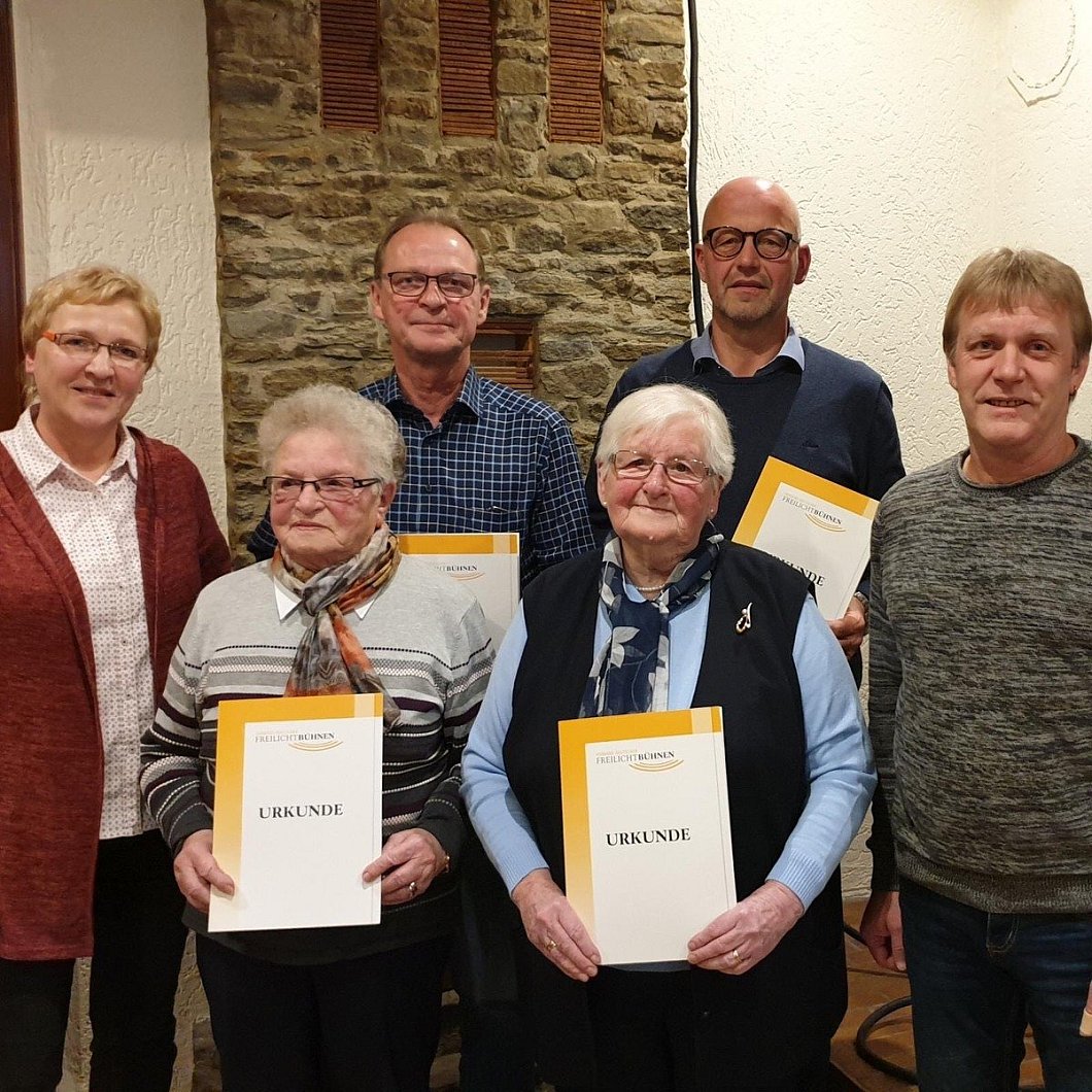 Außerdem wurden Marie Stark und Marlies Pries für 70 Jahre Vereinszugehörigkeit geehrt. Beide sind auch heute noch aktiv in der Kostümschneiderei dabei. Dafür gab es einen extra Applaus aus der Versammlung. Auch Wolfgang Hovemeyer konnte dieses Jahr sein 70. Jubiläum feiern. Aufgrund seiner ebenfalls langjährigen Vorstandsarbeit, der Gründung der Jugendgruppe in den 1960ern sowie die Installation des Wintertheaters wurde er bereits im Sommer durch Heribert Knecht, dem Vorstandsvorsitzenden des Verbands Deutscher Freilichtbühnen, für seine hervorragende innovative Arbeit geehrt.