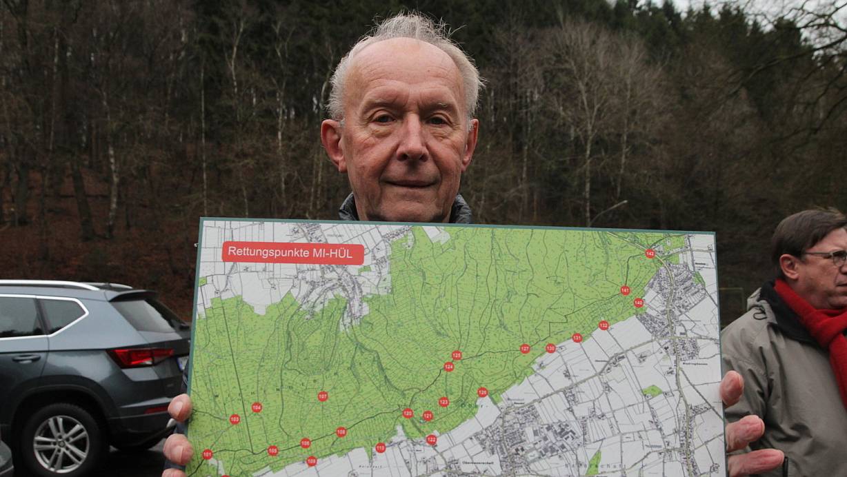 Kurt Zacharias zeigt die Karte mit den 24 Rettungspunkten im Oberbauerschafter Wiehengebirge | © Klaus Frensing