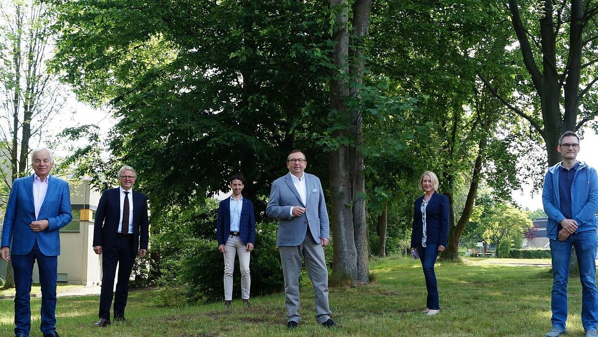 Kreisvorsitzender Frank Schäffler (2.v.l.) und Spitzenkandidat Hans-Eckhard Meyer (4.v.l.), mit Ulrich Kreft (Platz 4, ganz links), Nikolaus Netzel (Platz 5/3.v.l.), Susanne Engelking (Platz 2/5.v.l.) und Matthias König (Platz 3/6.v.l.) | © Michael Grundmeier