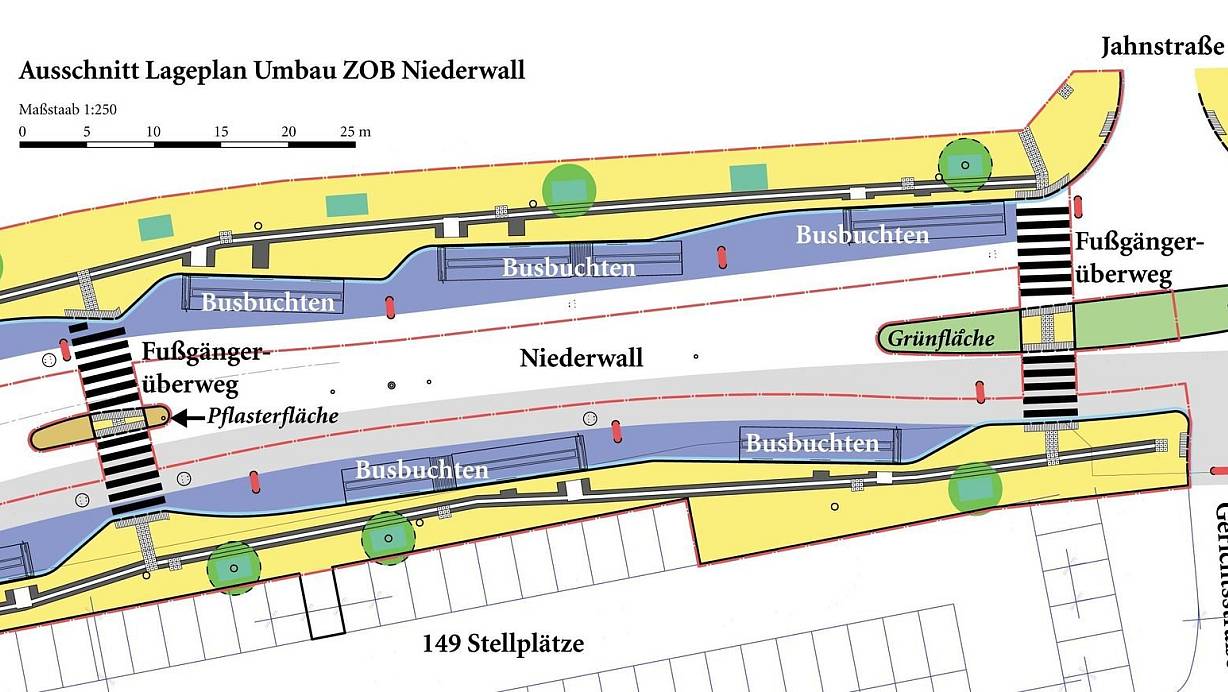 Diese Planzeichnung der Ingenieursgesellschaft Masuch und Olbrisch trägt das Datum 15. Oktober 2019 und zeigt den aktuellen Planungsstand für den neuen ZOB am Niederwall | © Ingenieursgesellschaft Masuch + Olbrisch / Jürgen Schultheiß