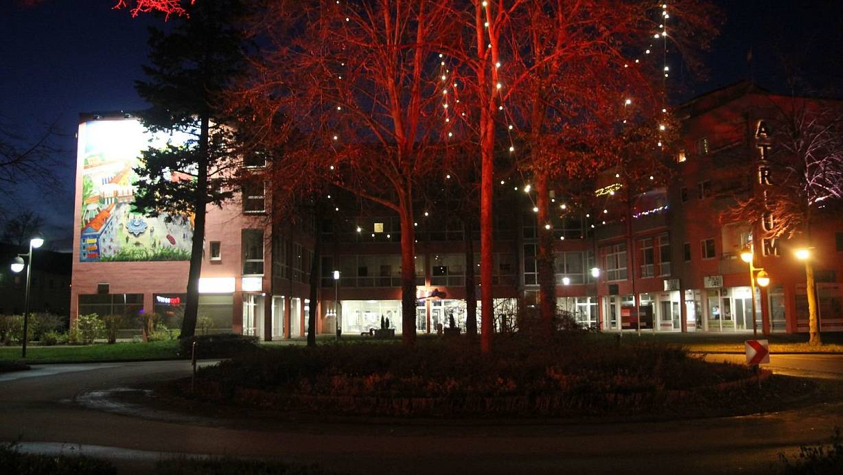 Mit Einbruch der Dämmerung wird die Espelkamper Innenstadt in farbiges Licht getaucht wie hier am Kreisel Rahdener Straße/Breslauer Straße. | © Klaus Frensing
