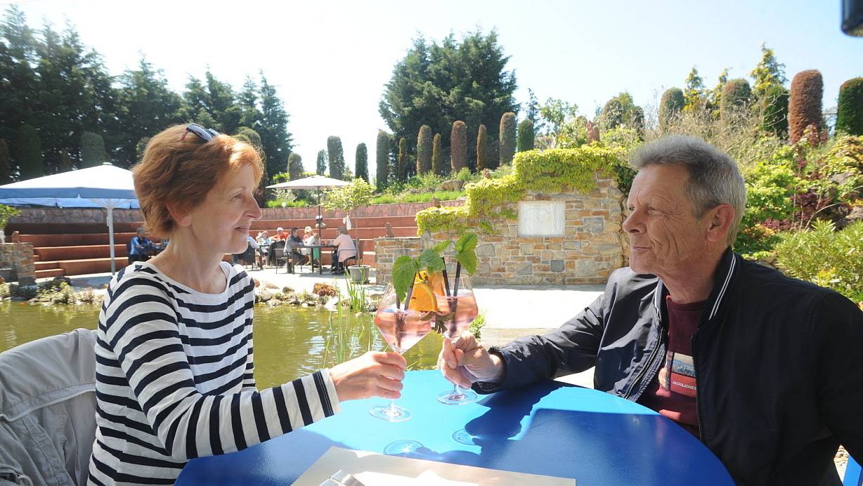Und Prost: Viele Menschen zog es bei frühlingshaftem Wetter am Sonntag ins Freie. In den Rila-Gärten in Levern freuten sich auch Sabine Paßlick und Uwe Windhorst, dass die Gastronomie wieder öffnet. | © Joern Spreen-Ledebur