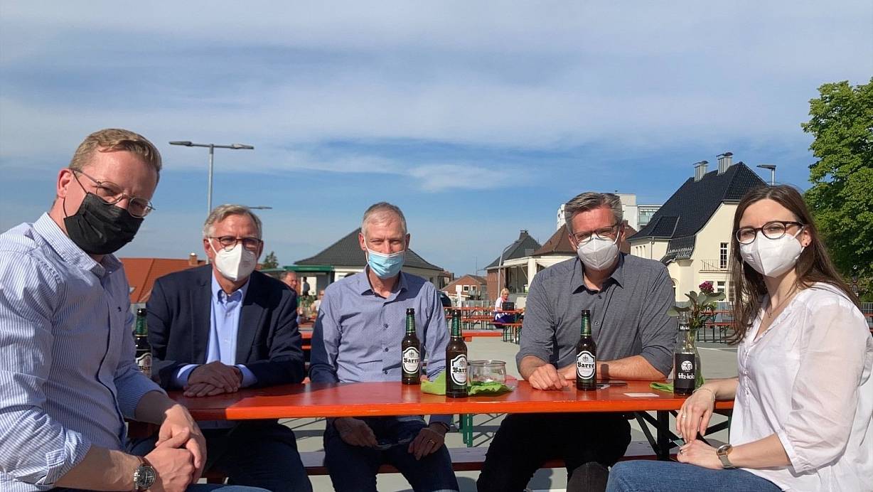Greenfiber-Geschäftsführer Paul Gummert (v. l.), Markus Hannig, Geschäftsführer der Stadtwerke Lübbecke und Bürgermeister Frank Haberbosch feierten mit Thorsten Appel und Nina Wehmeyer vom TuS N-Lübbecke die Büroeröffnung. | © Greenfiber