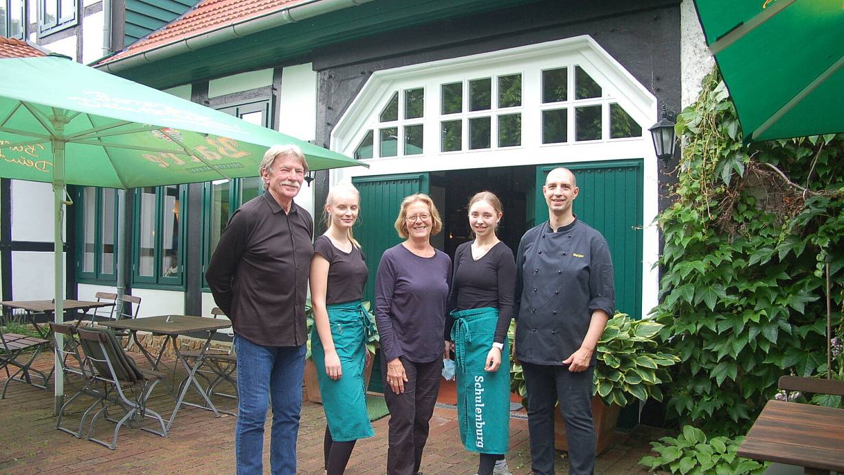Jürgen Schulenburg (v. l.), Valeria Brune, Ursula Schulenburg, Pauline Heuer und Marjan Loncaric vor dem Gasthaus "Schulenburg". | © Ingrun Waschneck