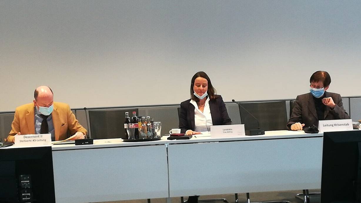 Kreis-Dezernent Hans-Joerg Deichholz (v. l.), Landrätin Anna Katharina Bölling und die Leiterin des Krisenstabes, Cornelia Schöder, setzen auf Wissenschaft und Vernunft. | © Frank Hartmann
