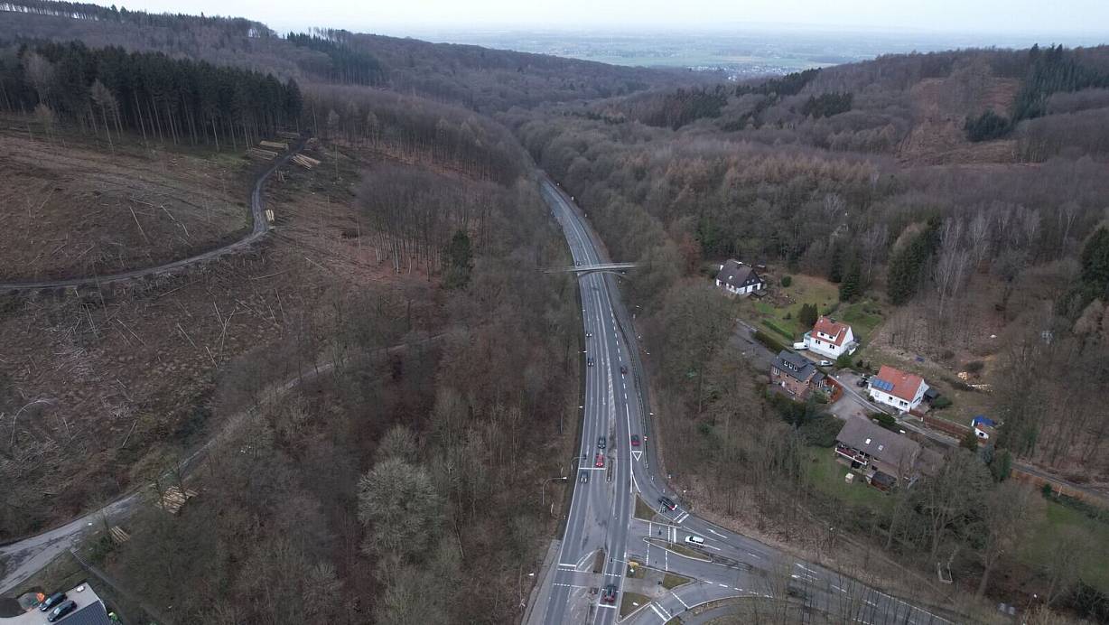 Die B 239 aus der Vogelperspektive: Ab der Kreuzung Horst Höhe/Ahlsener Straße (unten) wird die einspurige Sperrung in Richtung Norden eingerichtet. Foto: Torsten Hagemann | © Torsten Hagemann