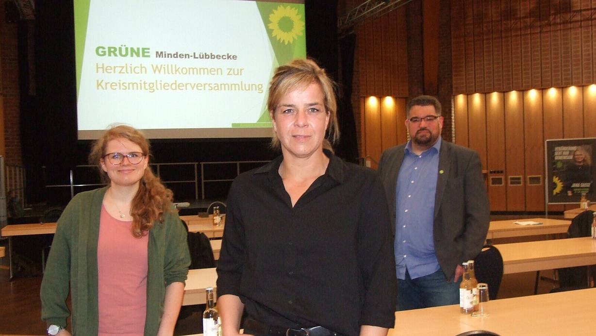 Die grüne Spitzenkandidatin Mona Neubaur (vorne) besuchte mit den Landtagskandidaten des Kreises Minden-Lübbecke Jana Sasse und Benjamin Rauer die Kreismitgliederversammlung im Espelkamper Bürgerhaus. | © Karsten Schulz