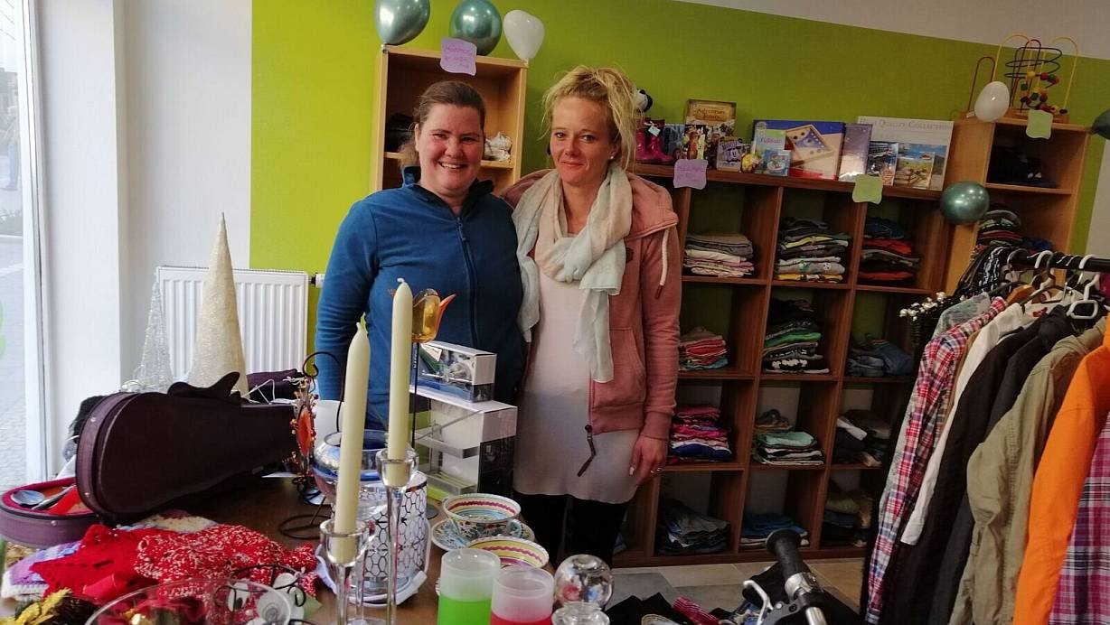Saskia Cordes und Jasmin Striedelmeier bieten im Secondhandladen Dekoratives, Nützliches, Spielzeug und auch Kleidung an. | © Ingrun Waschneck