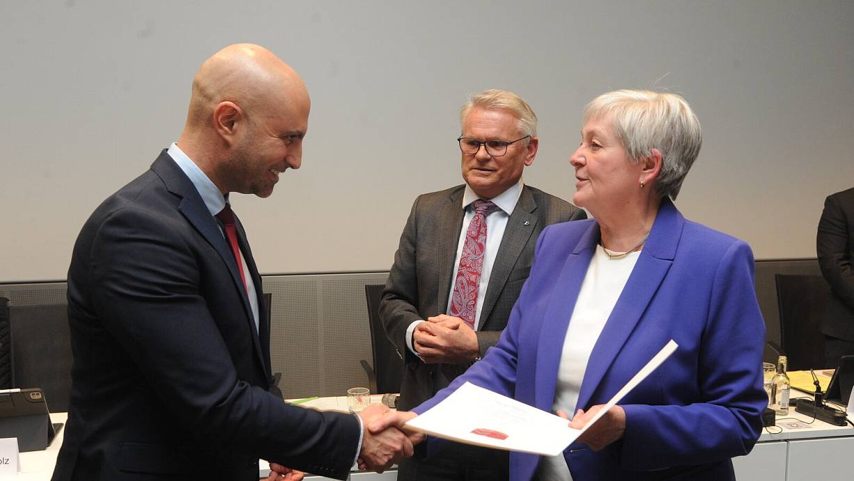 Landrat Ali Dogan wurde am Montag im Kreistag vom 1. stellvertretenden Landrat Michael Grosskurth und von Kreisdirektorin Cornelia Schöder in sein Amt eingeführt. Foto: Joern Spreen-Ledebur | © Joern Spreen-Ledebur
