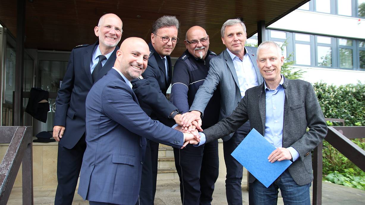 Bekräftigten vor dem Lübbecker Rathaus die Zusammenarbeit: Ali Dogan (vorn l.), Mathias Schmidt, Frank Meyer, Dirk Niemeyer, Ralf Stühlmeyer und Frank Haberbosch. | © Frank Hartmann