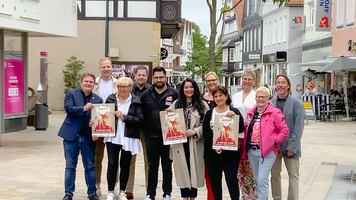 Jan-Christoph Wehrmann (Stadt Lübbecke, Wirtschaftsförderer), Steffen Weymann (Weymann Optik & Akustik), Christiane Levermann (CL), Peter Schmüser (Lübbecke Marketing), Soysal Caglar (SB-Lüning), Hüma Akar (Fashion Store), Sandra Koch (Stadt-Parfümerie Pieper), Stella Mohrfeld (Parfümerie HC), Britta Goertz (Schuhhaus Meyer und ABC Schuhe), Sabine Kolck-Pothe (Modehaus Böckmann) und Ralf Achterberg (Achterberg Optik) freuen sich auf die Premiere von "Wappenplatz um 11" am 10. Juni. | © Lübbecke Marketing