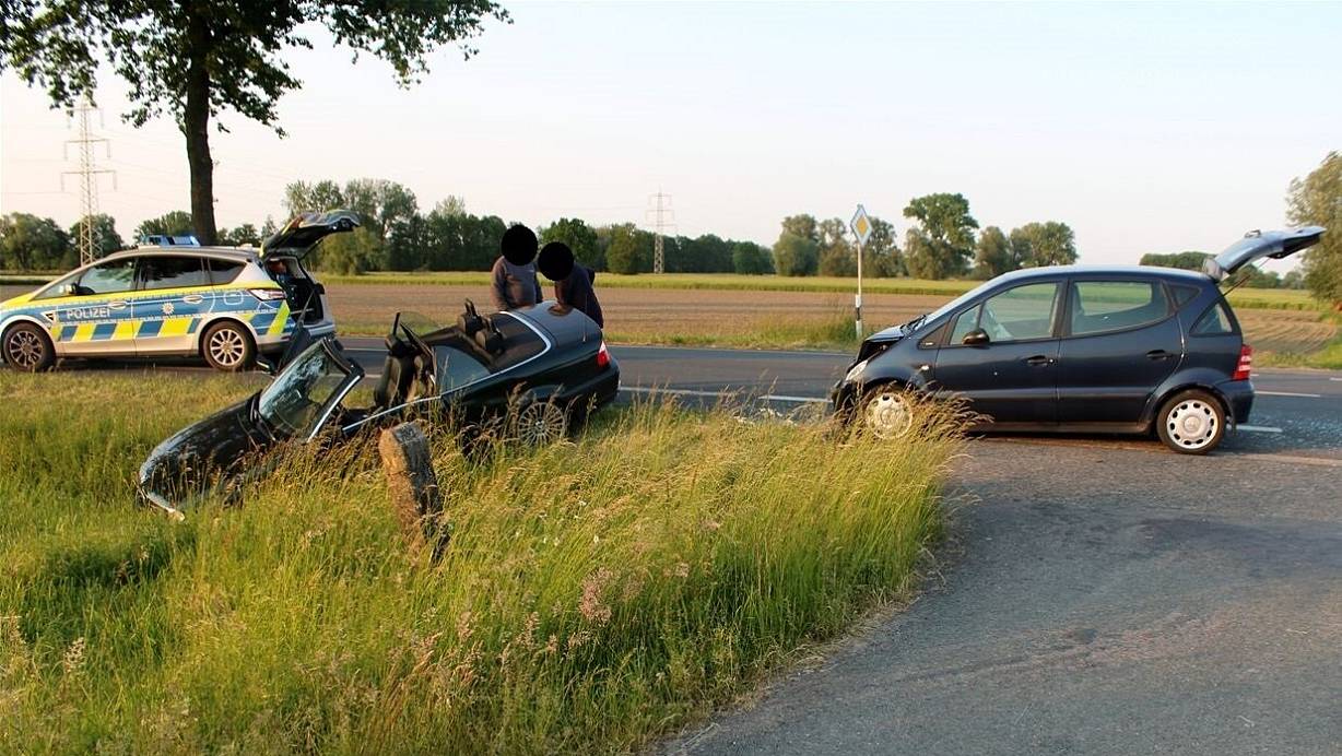 Zeitgleich befuhr ein 65-jähriger Meller mit seinem Mercedes die Eikeler Straße in Richtung Alswede. Hierbei stieß er mit seiner A-Klasse in die Fahrerseite des BMW. Durch die Wucht der Kollision schleuderte das Cabrio in den angrenzenden Straßengraben. Die beiden Fahrer zogen sich hierbei leichte Verletzungen zu. Sie wurden zur ambulanten Behandlung mit Rettungswagen ins Krankenhaus Lübbecke gebracht.