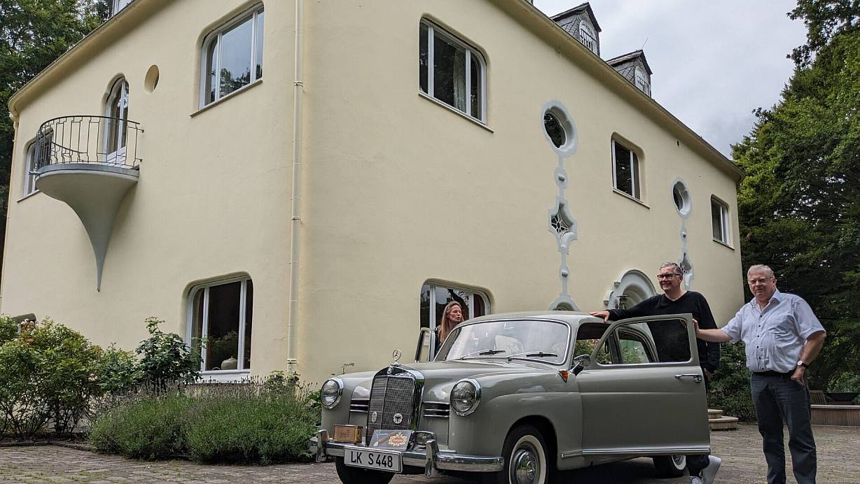 Freudiges Wiedersehen an der Blase-Villa von 1934. Jörg Steinkamp hat den Blase-Oldtimer von 1958 im Jahr 1999 in Lübbecke gekauft, nun war er wieder am Wiehen - für einen Tag mit altem LK-Kennzeichen. Links Anuschka Blase, Jörg Steinkamp (Mitte) hat den alten Diesel liebevoll gepflegt. Rechts Volker Knickmeyer, der das ungewöhnliche Treffen initiiert hat. | © K. F. Reisebrink