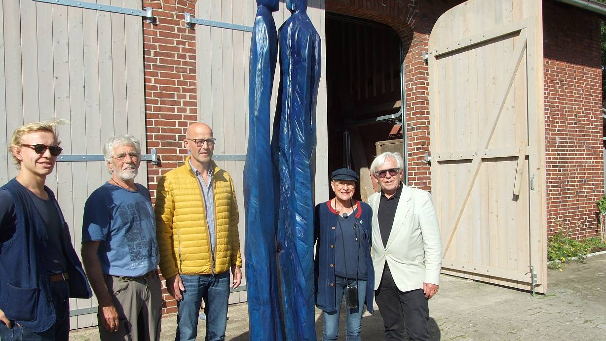 Timm Lindstedt, rechts neben ihm der Künstler Rainer Ern, Dorfgemeinchafts-Vorsitzender Helmut Öwermann, die Skulptur "Blue Hour", es folgen Lea und Karl Lindstedt. | © Karsten Schulz