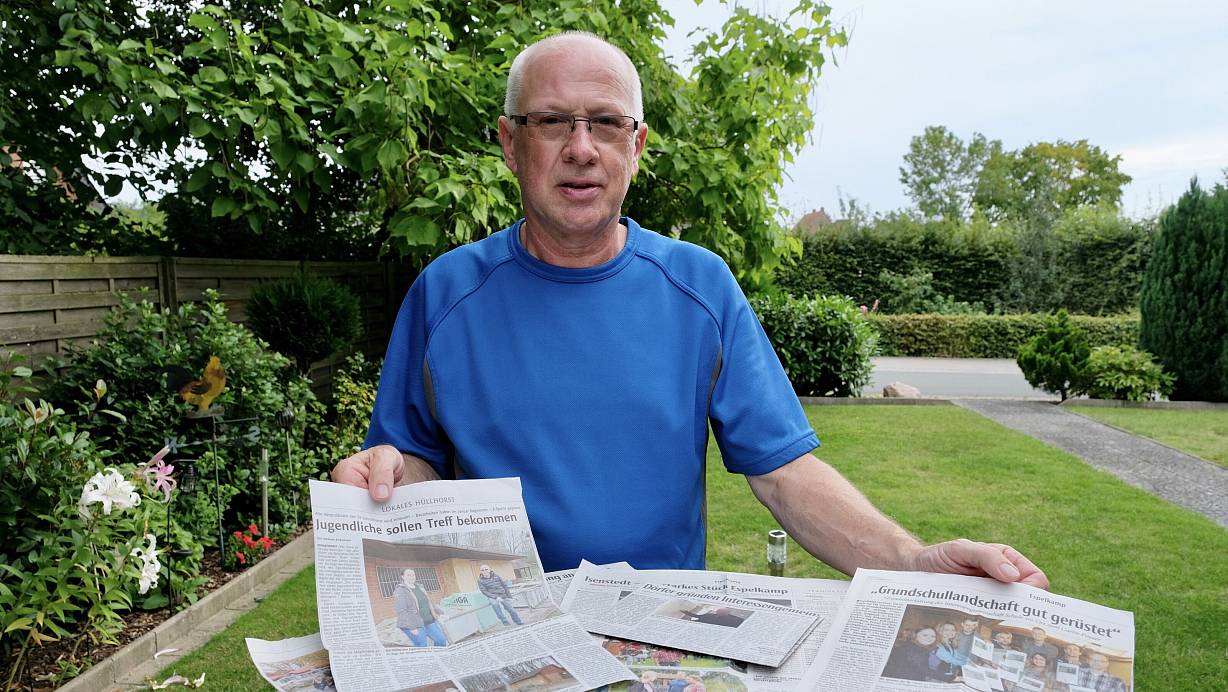 Rainer Kütemann im Garten seines Elternhauses in Isenstedt. Er sichtet die vielen Zeitungberichte, die in seinem 40 Jahre währenden ehrenamtlichen Leben entstanden sind. | © Heike von Schulz