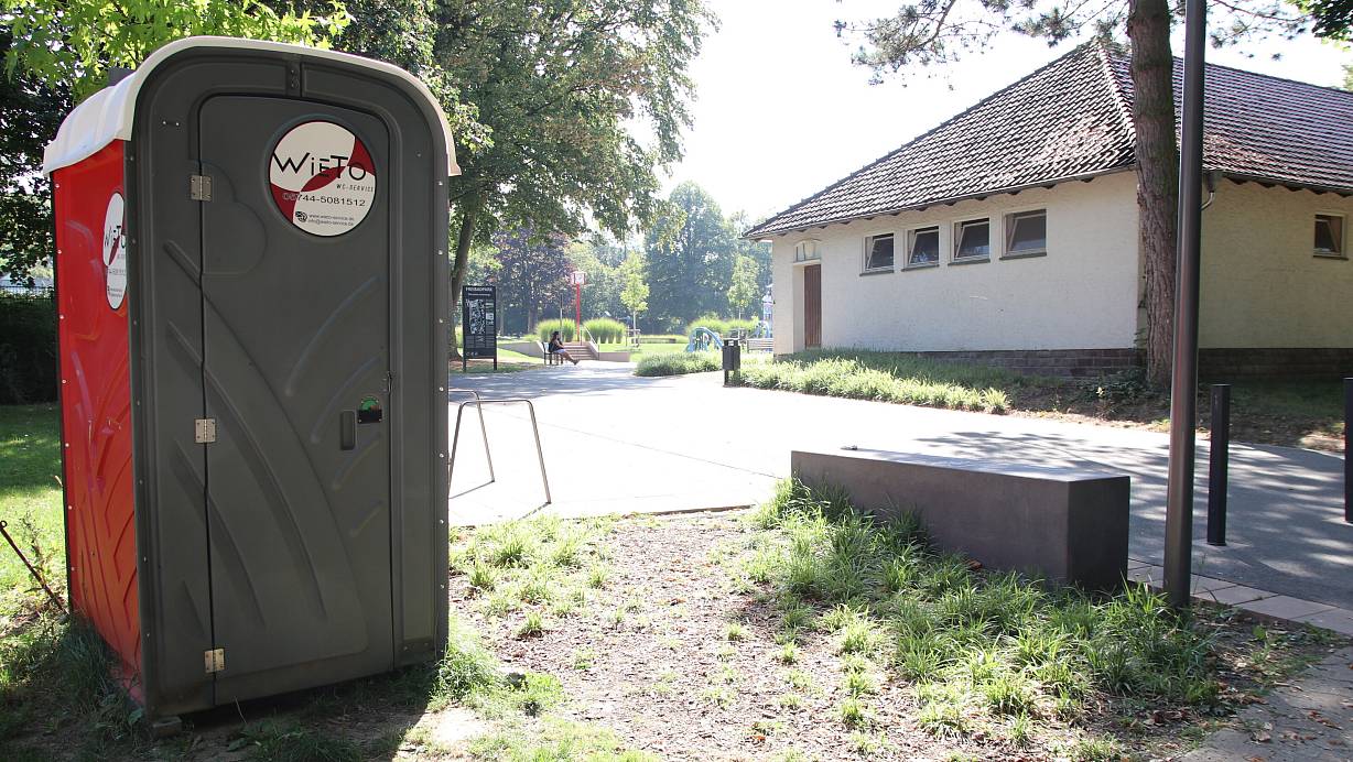 Nur diese Miettoilette steht im Freibadpark Lübbecke für die Besucher bereit. | © Sevim Hangül