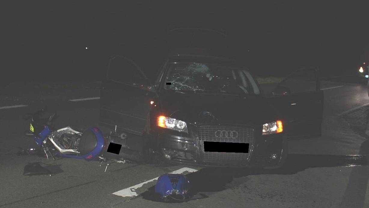 Anhand der Spurenlage ergibt sich laut Polizeimitteilung folgender Unfallhergang: Demnach fuhr ein 23-Jähriger aus Preußisch Odendorf gegen 21.30 Uhr mit seinem Audi den Stukendamm in Richtung B 65. In Höhe des Grappensteiner Damms wollte er nach links abbiegen. Da ihm ein Fahrzeug entgegenkam, hielt er an, um dieses passieren zu lassen. Anschließend leitete er seinen Abbiegevorgang ein. Hierbei erkannte er in letzter Sekunde das entgegenkommende Zweirad. Dann sei es zum Frontalzusammenstoß der beiden Fahrzeuge gekommen.
