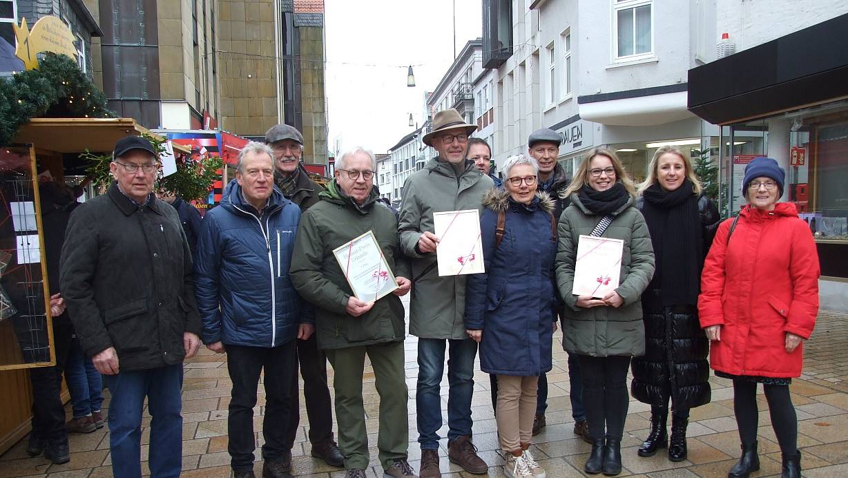 Die Preisträger stellten sich mit Jurymitgliedern zu einem Foto in die Lübbecker Fußgängerzone. Das Foto zeigt (v.l.) Friedhelm Bartling, Werne Klusmeier, Ged Husmeyer, Klaus Bernotat, Helmut Öwermann, Susanne Öwermann-Röding, Peter Schmüser, Anne Nentwich, Frank Haberbsch, Daniela Beckemann-Beihl und Erika Müller. | © Karsten Schulz