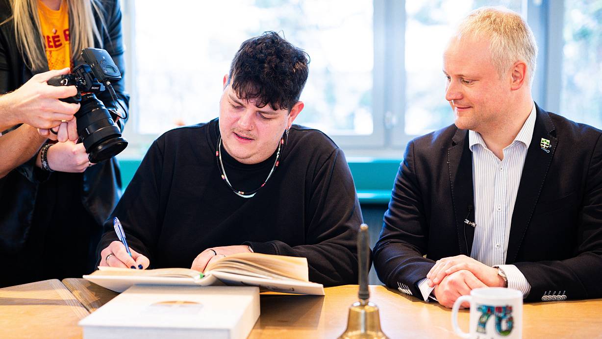 Isaak Guderian unterschreibt im Goldenen Buch der Stadt Espelkamp. Am Freitag gewann er den Vorentscheid zum Eurovision Song Contest in Schweden und tritt für Deutschland am 11. Mai in Malmö an. Im Bild mit Espelkamps Henning Vieker.